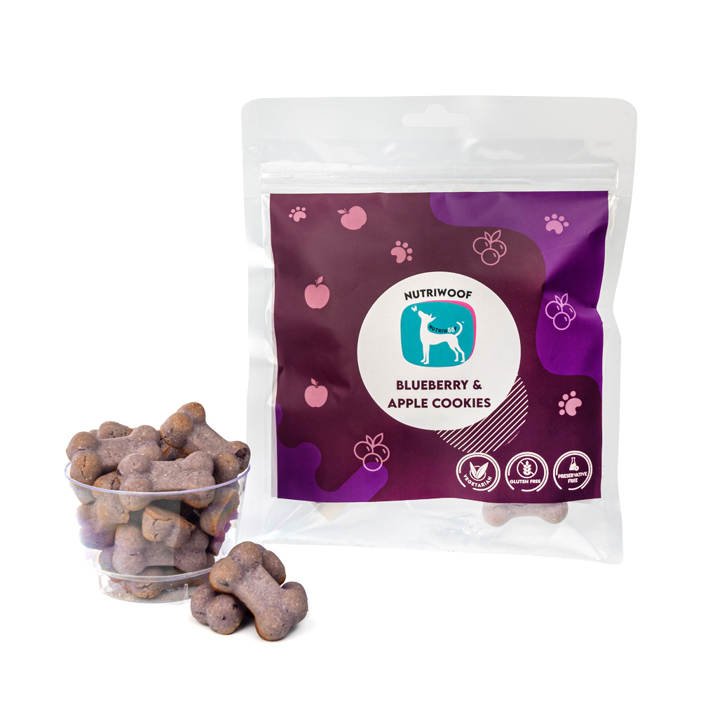 - Our blueberry and apple cookies contain all natural ingredients like blueberry, rice flour, coconut flour & apple. This delectable treat is sure to leave your pooch wanting more.