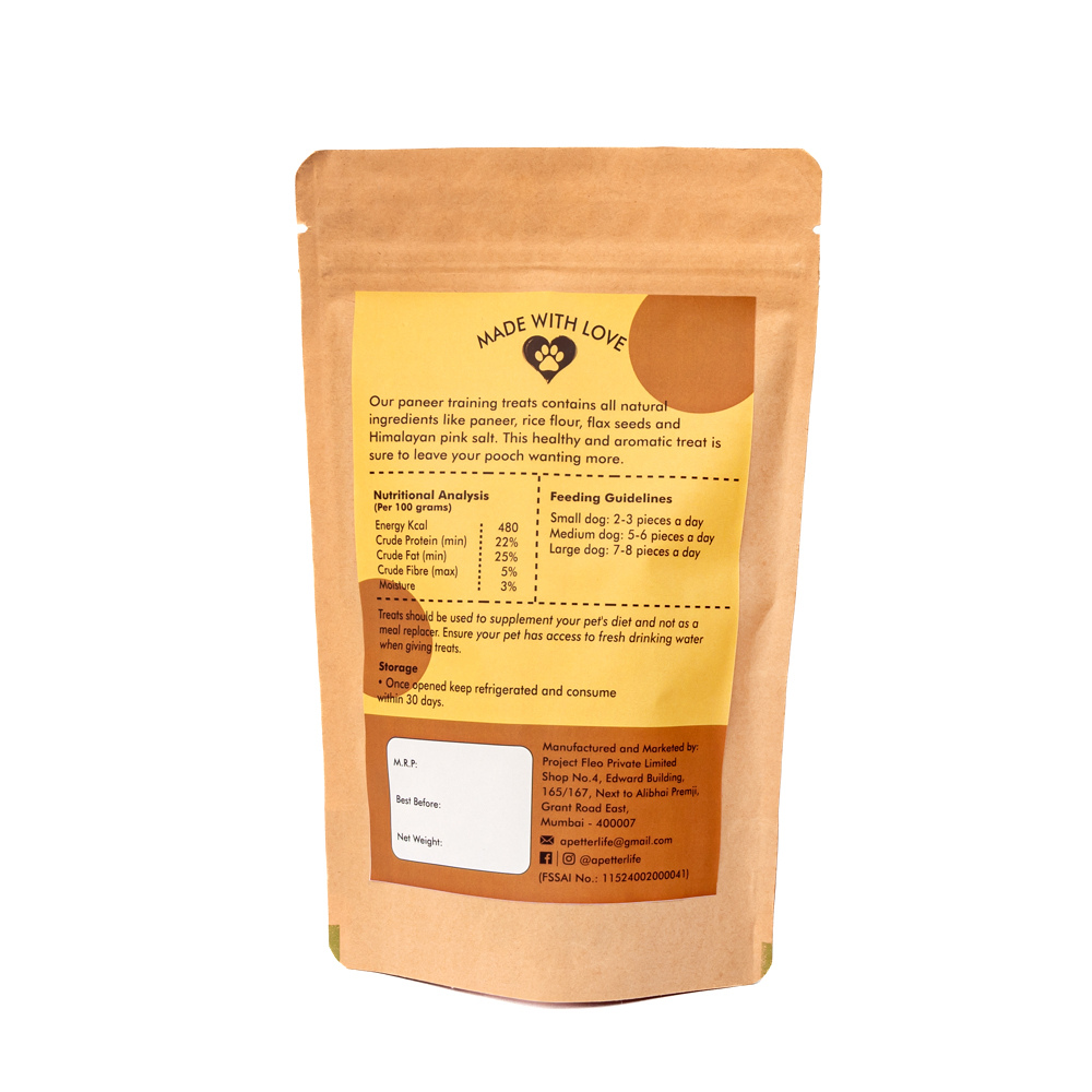 - Our paneer training treats contains all natural ingredients like paneer, rice flour, flax seed and Himalayan pink salt. This healthy and aromatic treat is sure to leave your pooch wanting more.